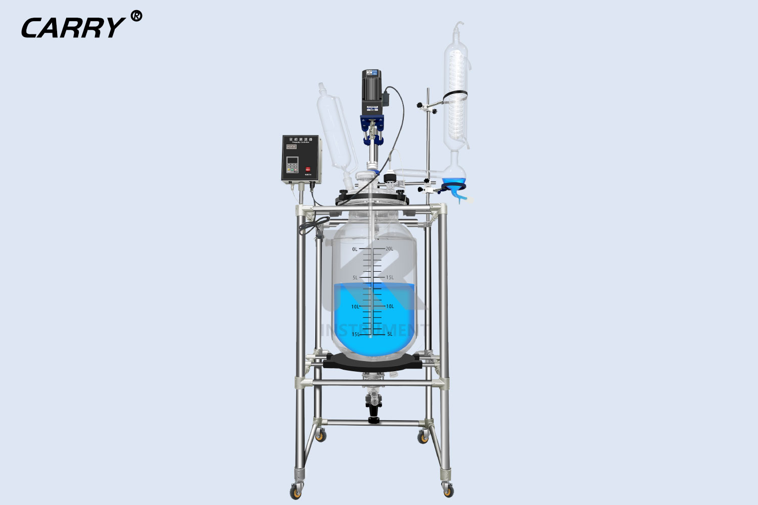 50L雙層玻璃反應(yīng)釜具有電動恒速攪拌系統(tǒng)、冷凝、滴加系統(tǒng),釜體夾層需外接...